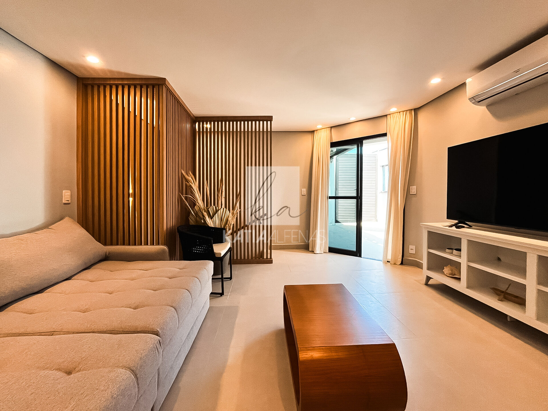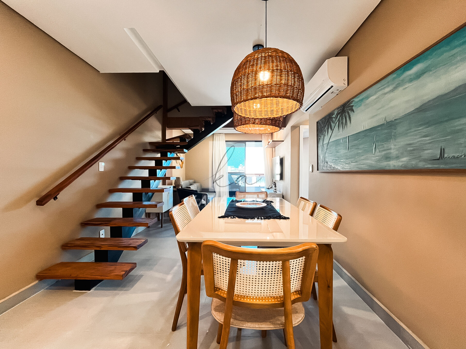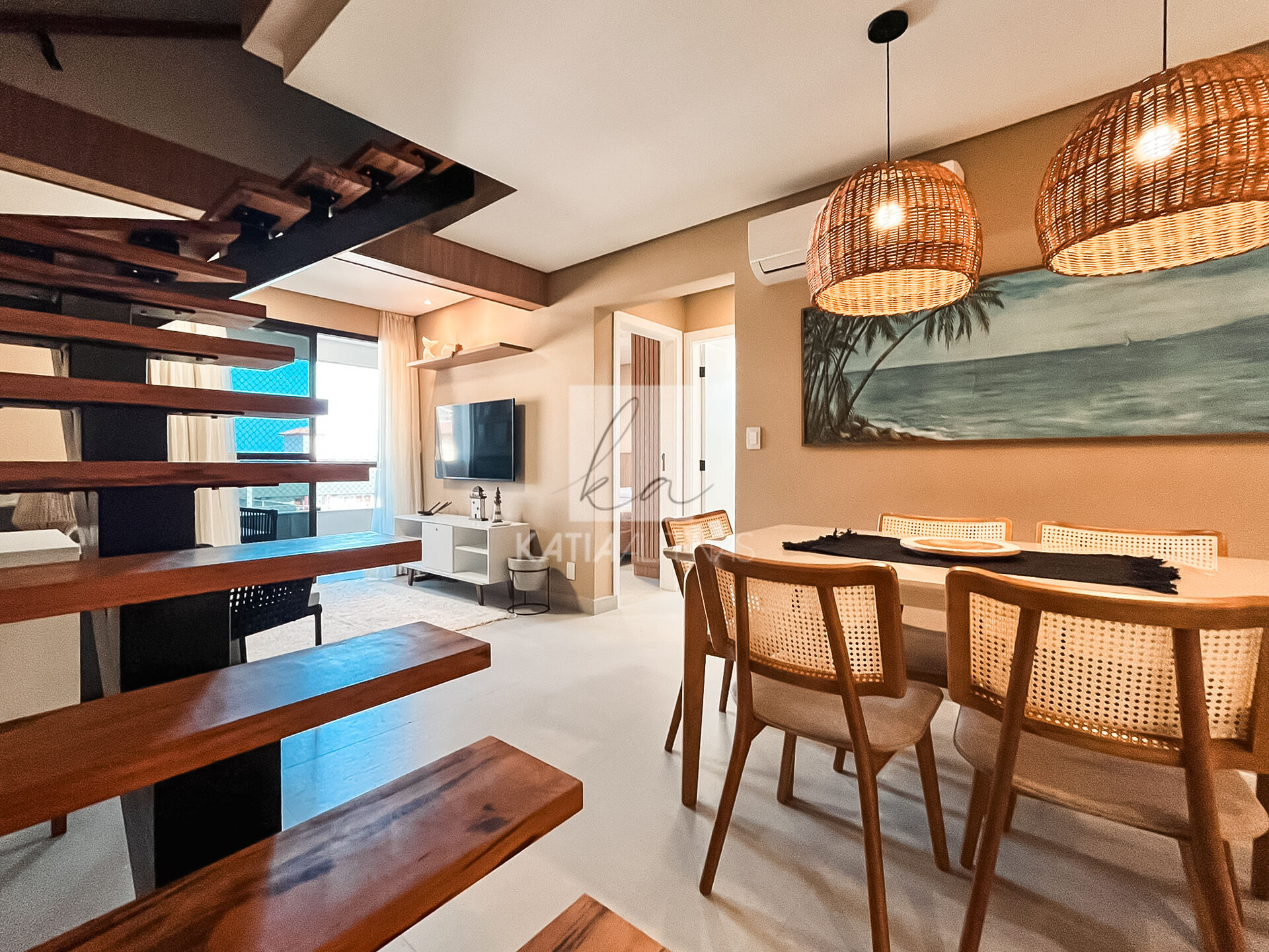 O acesso ao segundo piso é por uma escada linda em madeira, e já entramos para a sala de tv super aconchegante com um lavabo para maior conforto.