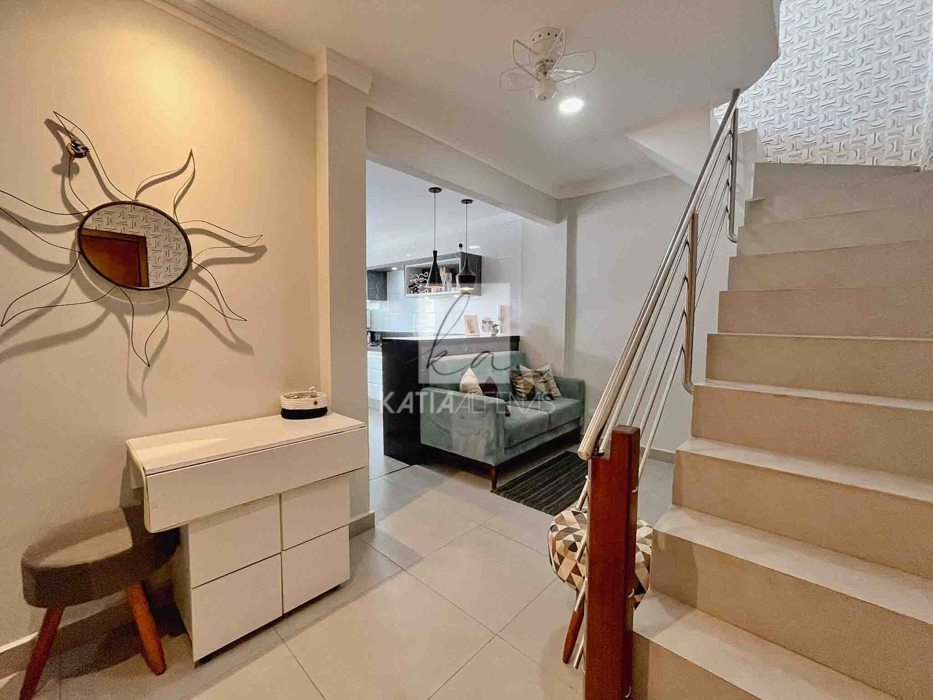 As escadas dão acesso ao segundo piso, com sala ampla, lavabo, uma suíte, além de uma varanda gourmet completa e espaçosa.