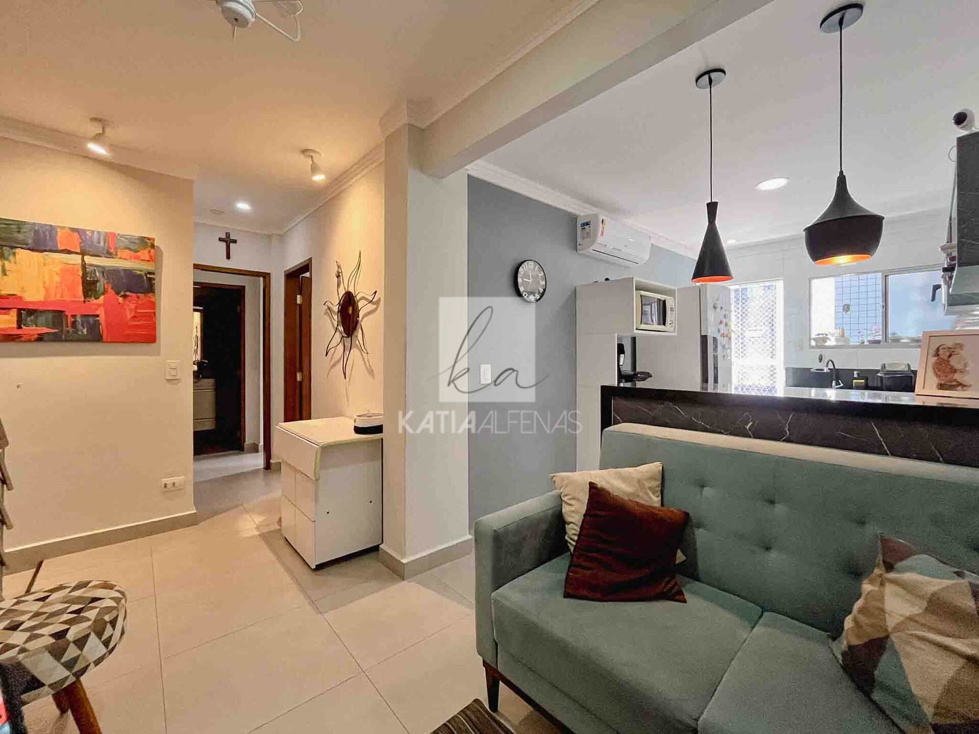 No primeiro piso estão distribuídos a sala, cozinha tipo americana, área de serviço, um dormitório com acesso à varanda e uma suíte.
