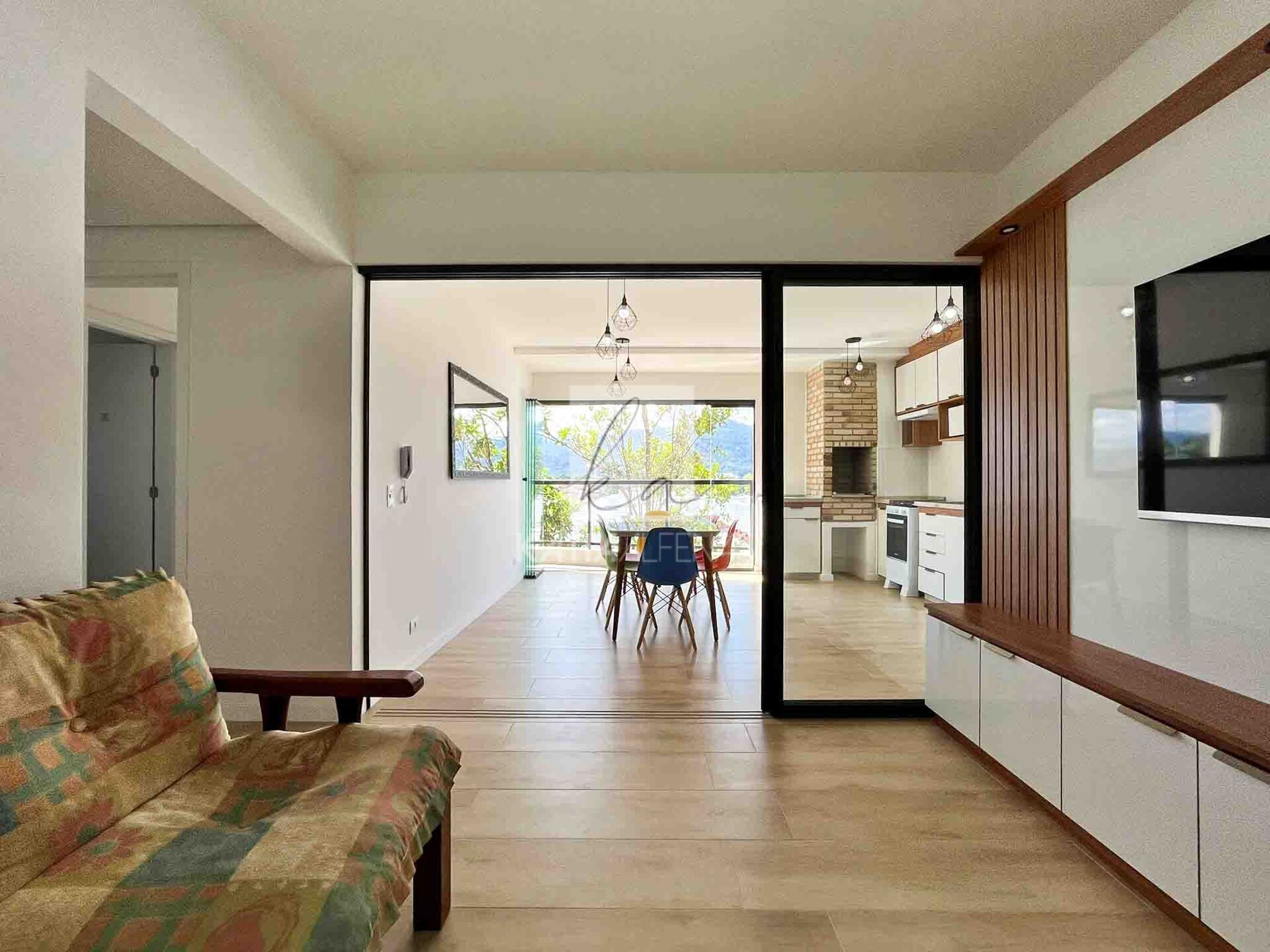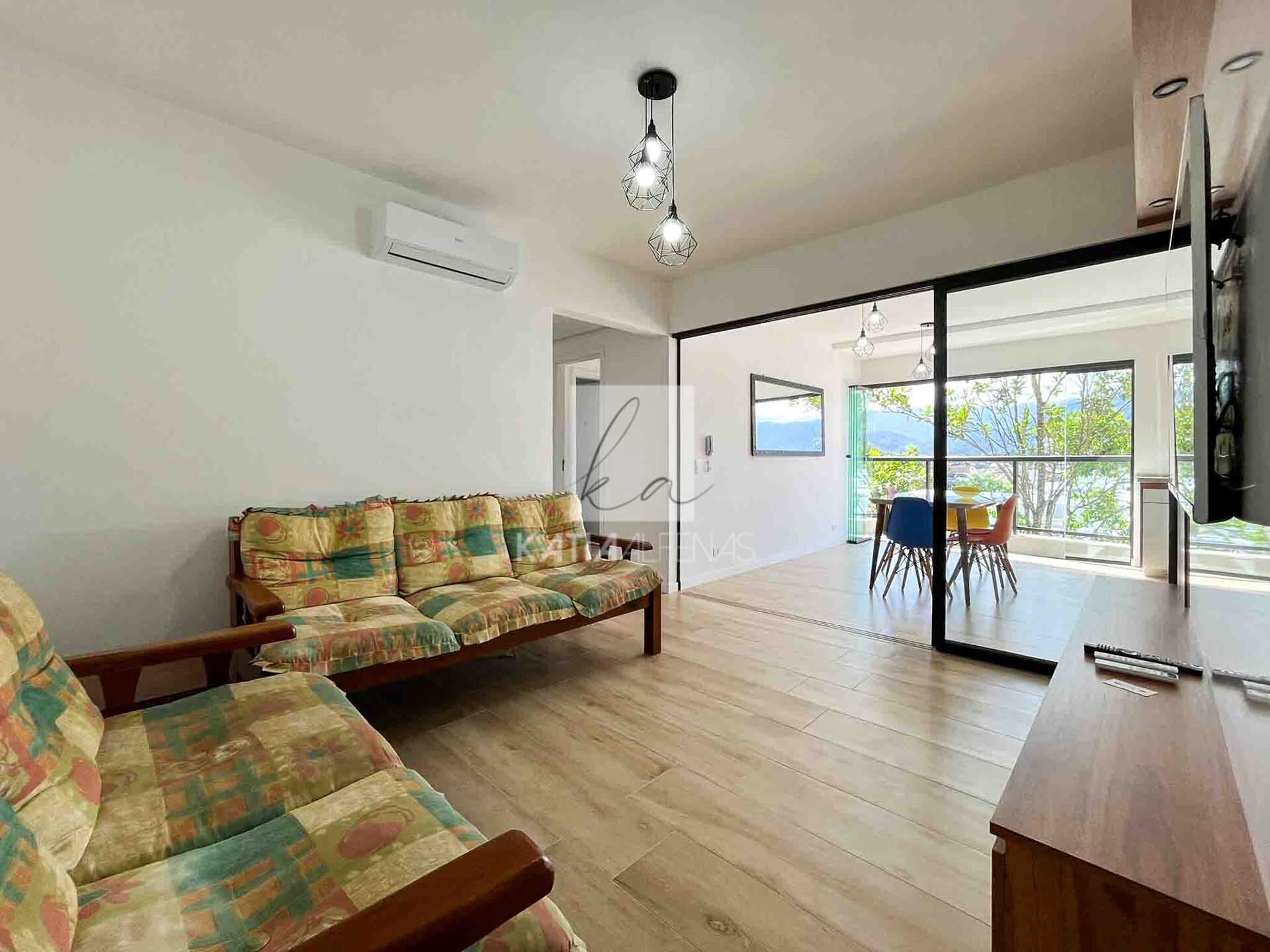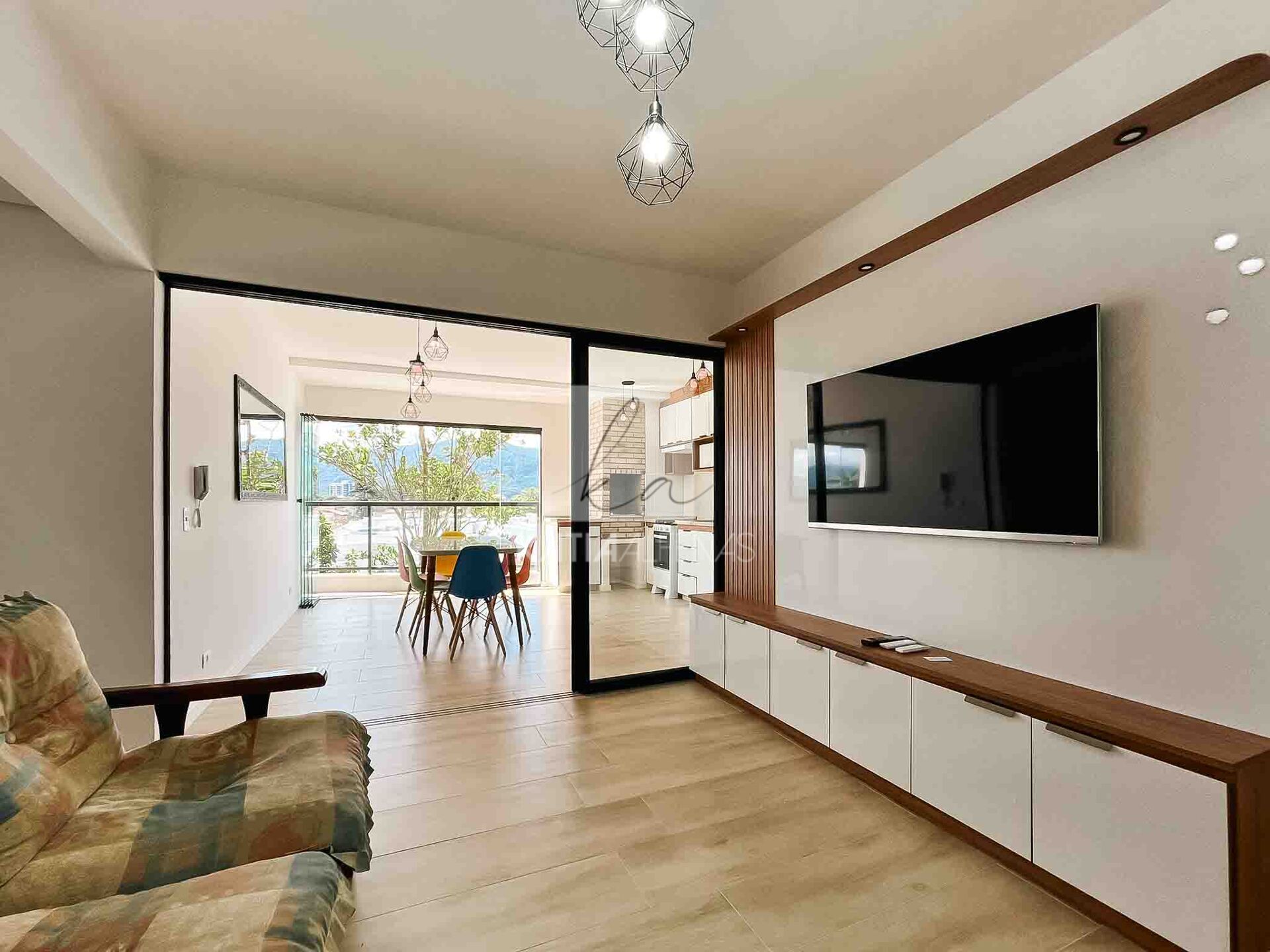 O apartamento está mobiliado, tem 77m² e oferece espaços amplos e dinâmicos, valorizando o convívio e a circulação entre os ambientes.
