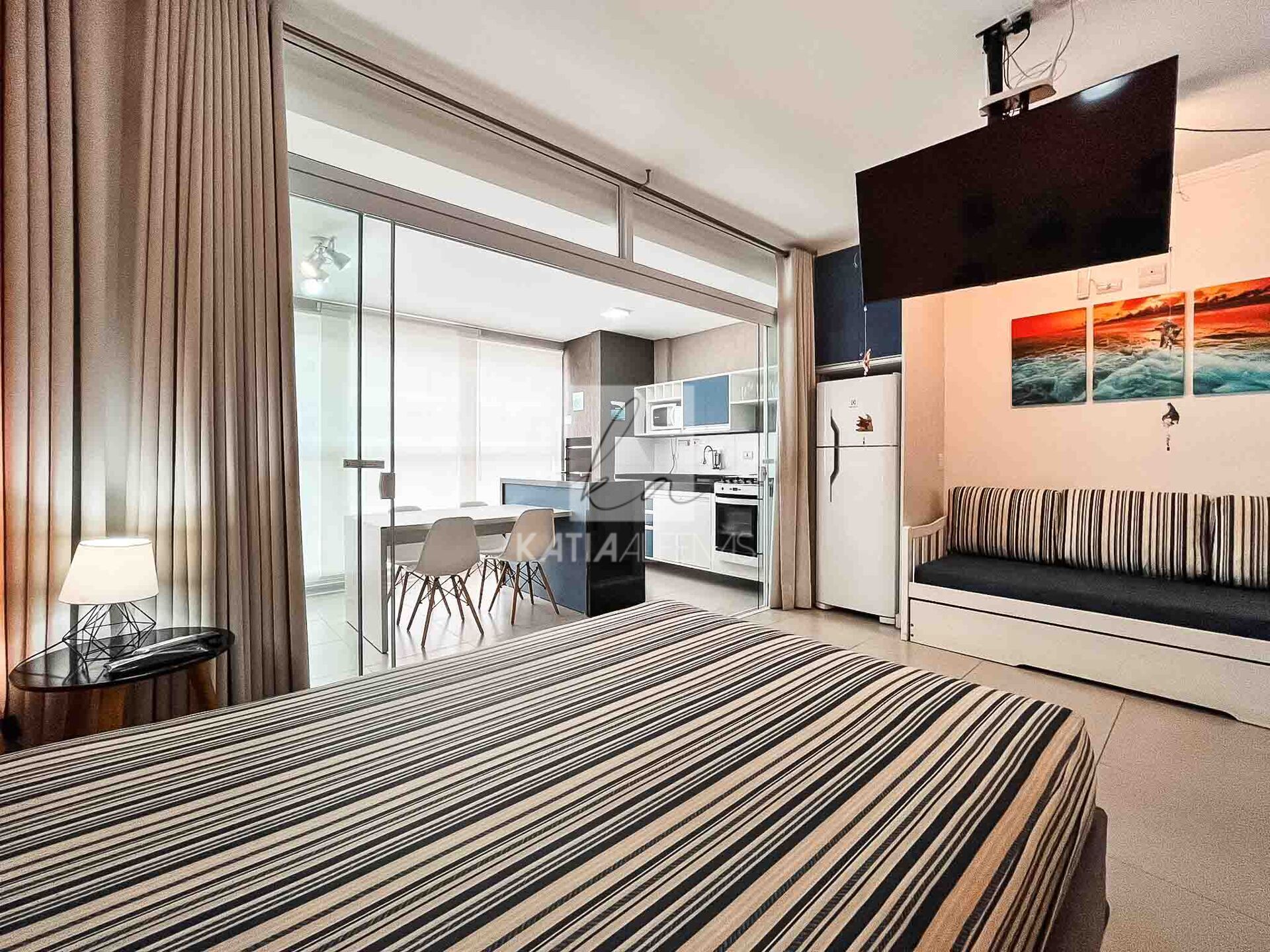 Localizado no 1º andar, o Studio possui 41m² de área privativa, mobiliado com móveis planejados, climatizado e pronto pra receber.