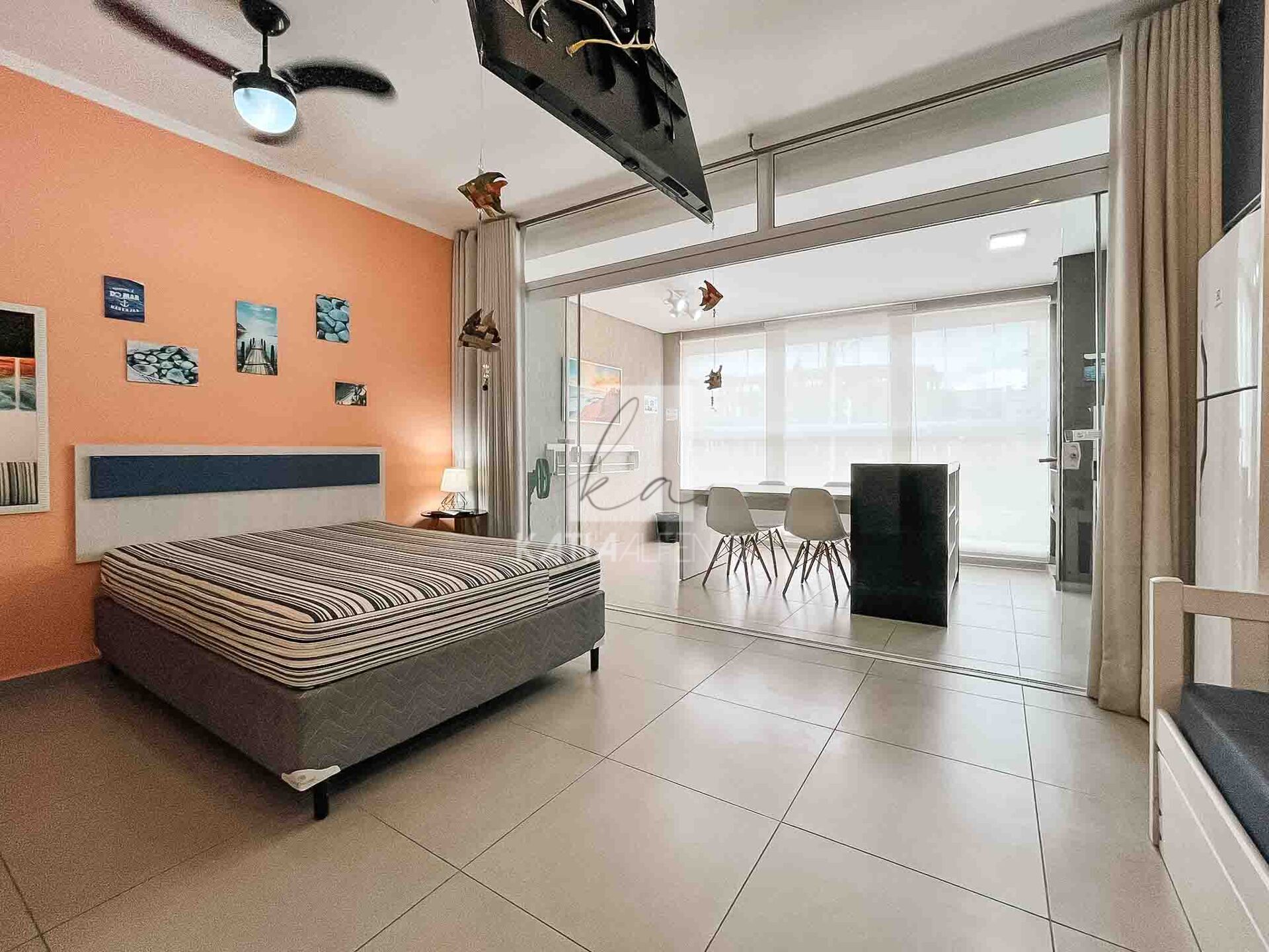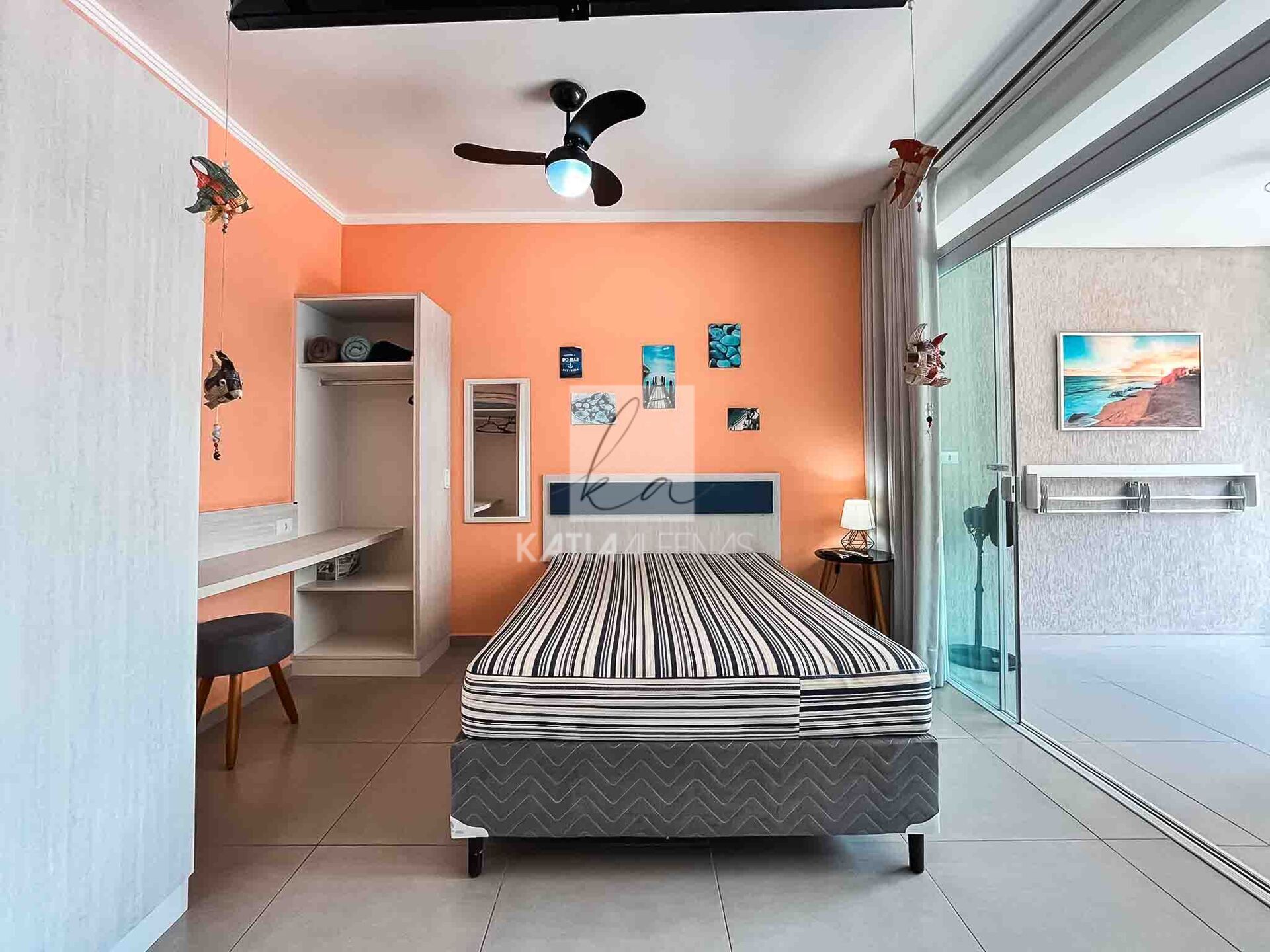O espaço integra o dormitório com uma cama de casal e um sofá bicama com dois colchões de solteiro confortáveis para as acomodações, armários planejados, smart tv com suporte articulado, sofá e mesa de escritório para home office e um banheiro social. A cozinha é equipada com geladeira, fogão, micro-ondas, possui churrasqueira integrada, uma ilha e mesa de jantar, tudo conectado, trazendo muita praticidade e conforto.