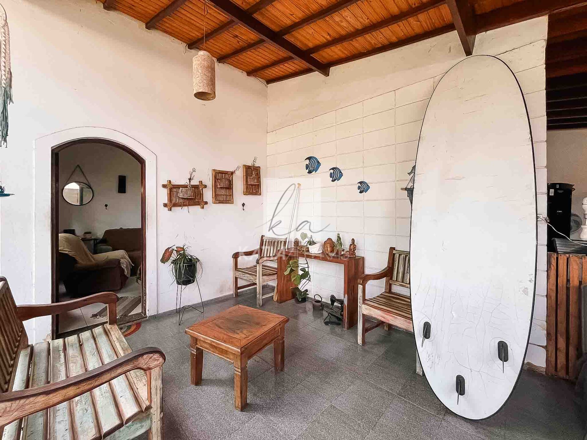 A casa tem 105m² de construção e está distribuída em uma sala, dois dormitórios, um banheiro, uma cozinha menor interna e um espaço gourmet integrado à varanda, que é bem aconchegante.