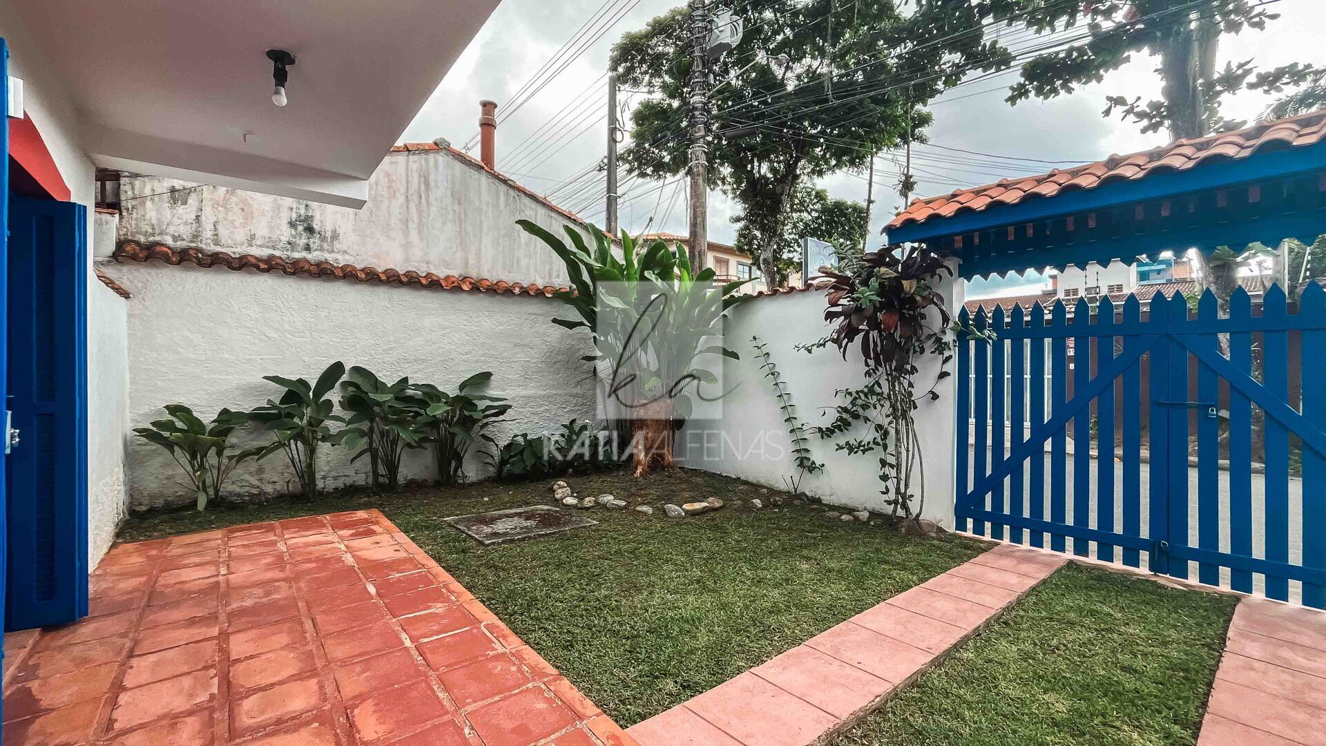 Já na parte externa da casa, à frente temos uma garagem para dois carros e nos fundos um quintal, com uma área coberta de churrasqueira.